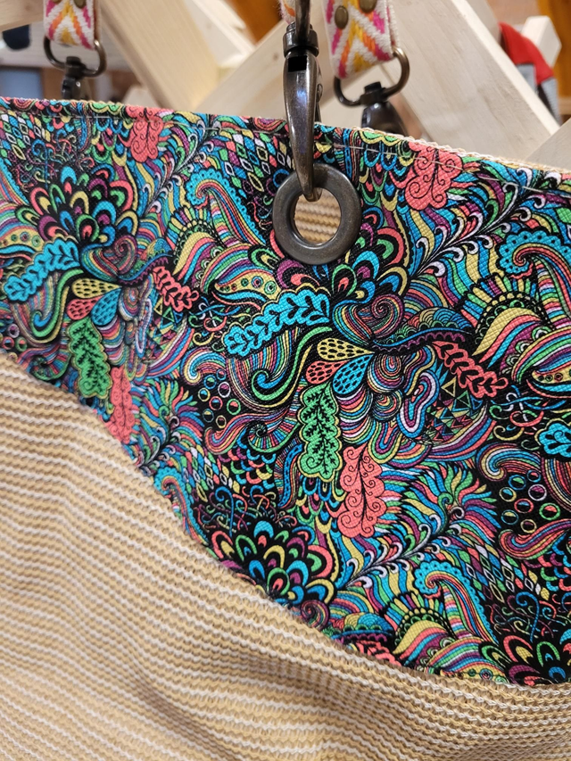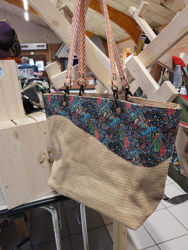 Original par sa matière : mélange de toile tricotée très solide (détournement d'une toile d'ombrage !) de simili coloré !