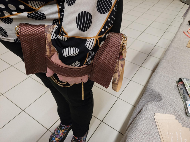 Pochette à porter à la main ou utiliser la dragonne ou la bandoulière dorée.