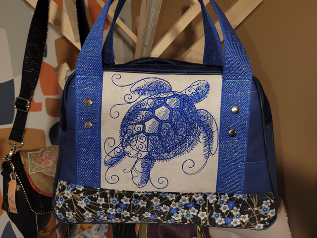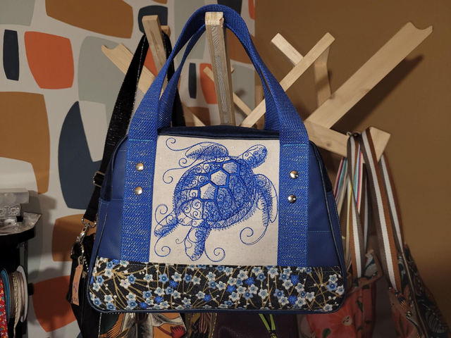 Avec une magnifique tortue brodée sur un coupon liège.
