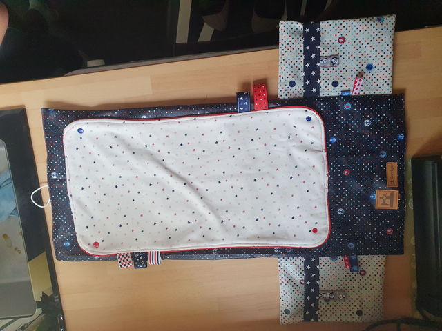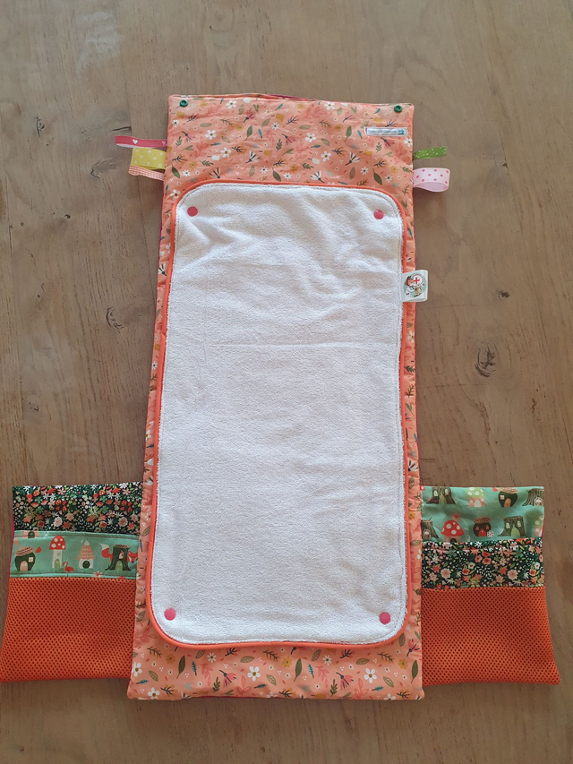 Tapis à langer dans sa pochette étanche (pratique pour changer bébé sur tous supports ou en cas de fuite !). Poche pour y mettre 1 ou 2 couches.